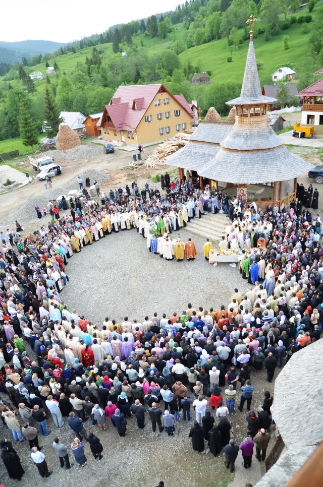 | Sacerdotes y fieles haciendo un "corazón" inmenso de oración por el Padre Iustin, en el Monasterio Petru Voda (22-05-2013).